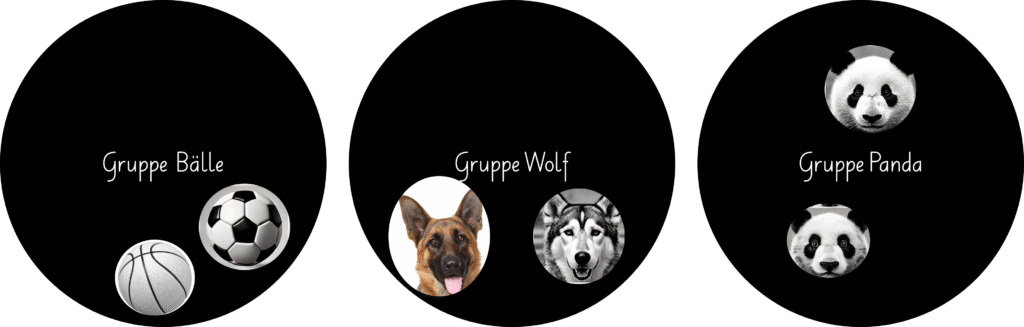 „Weitere Bilder kann ich nun in meine Gruppen einsortieren: Der Basketball kommt zur Gruppe Bälle, der Hund zur Gruppe Wolf, der Panda zur Gruppe Panda.“